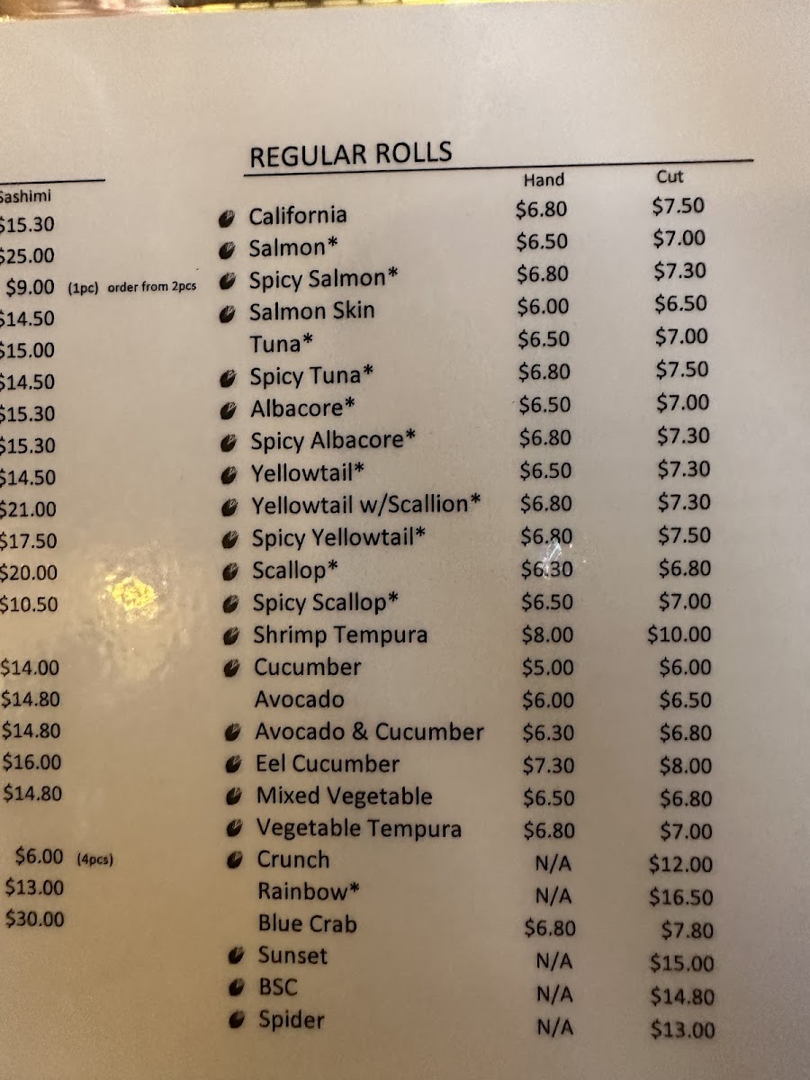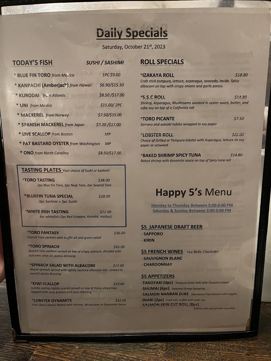 The menu is suitable for casual dining occasions, including lunch or early evening meals, with options that cater to both quick orders and more relaxed dining experiences. It accommodates those seeking traditional sushi preparations as well as cooked dishes typical of an izakaya setting.